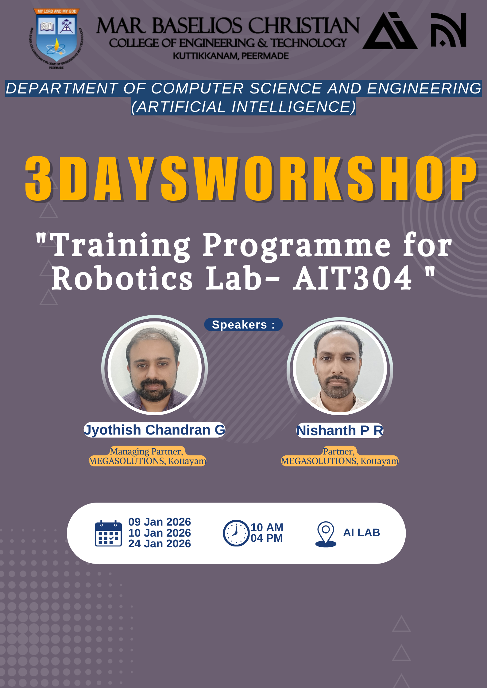 The Department of Computer Science and Engineering (Artificial Intelligence) at Mar Baselios Christian College of Engineering and Technology (MBCET), Kuttikkanam, successfully organized a three-day Training Programme for Robotics Lab (AIT304) at the AI Lab. The workshop was conducted on 9th January 2026, 10th January 2026, and 24th January 2026, from 10:00 AM to 4:00 PM, with the objective of enhancing practical knowledge and hands-on skills in robotics for faculty and students associated with the AI program. The sessions were led by industry experts Mr. Jyothish Chandran G, Managing Partner, Megasolutions, Kottayam, and Mr. Nishanth P R, Partner, Megasolutions, Kottayam. The speakers shared valuable insights into robotics systems, lab-oriented experimentation, and real-world applications aligned with the Robotics Lab curriculum (AIT304). The training programme provided participants with exposure to practical implementation, hardware interfacing, and emerging trends in robotics, thereby strengthening the teaching–learning process and industry relevance of the AI curriculum. The initiative reflects the department’s continuous efforts to bridge the gap between academic learning and industry practices.