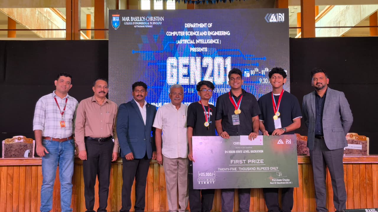 The Department of Computer Science (Artificial Intelligence) at Mar Baselios Christian College of Engineering and Technology (MBCCET), Peermade, successfully organized a 24-hour hackathon titled “Gen 201 – Creating the Next Generation” on October 10 and 11, 2025. The event was conducted as an All-Kerala level competition for Plus One and Plus Two students from government and government-aided higher secondary schools across the state. The hackathon aimed to encourage innovation, creativity, and problem-solving skills among young students while introducing them to Artificial Intelligence and emerging technologies.