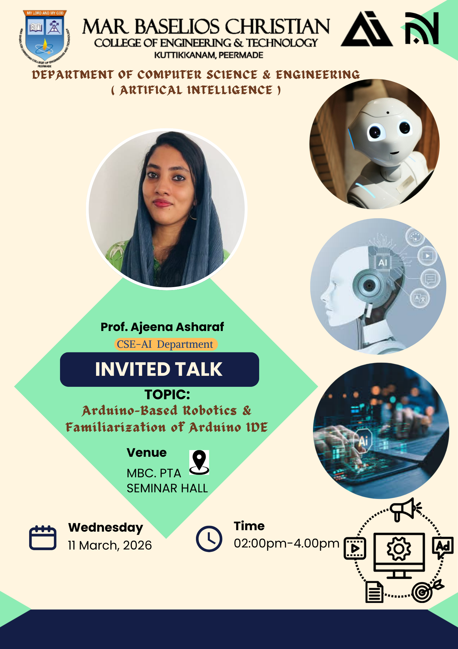 First-year Integrated M.Sc. Physics students of Marian College Kuttikkanam Autonomous attended a session on Arduino-based robotics and the Arduino IDE. The session introduced the basics of Arduino, its applications in robotics, and the key components used in Arduino-based projects. Students learned about the basic structure of Arduino programs and simple coding concepts using the Arduino IDE. They also visited the Robotics Lab to observe different robotic components and systems. A demonstration of a line-following robot helped them understand how sensors, motors, and controllers work together. The session concluded with a small coding activity that provided practical exposure to robotics programming.